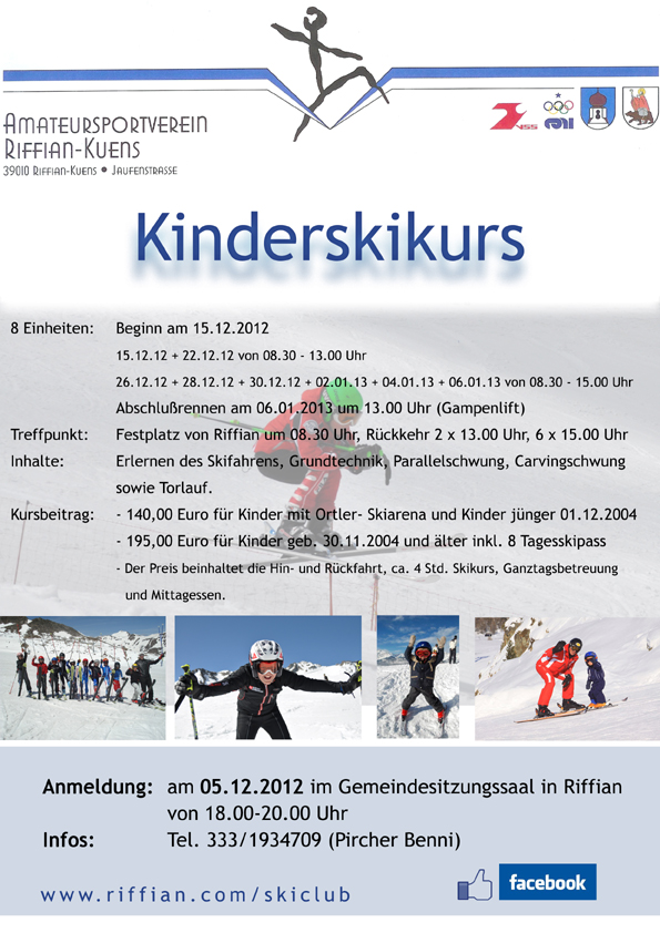 euch heuer organisiert die Sektion Ski des ASV Riffian-Kuens einen Kinderskikurs. Die Anmeldung findet wie immer am 05.12.2012 von 18.00 bis 20.00 Uhr im Gemeindesitzungssaal von Riffian statt. Alle weiteren Details könnt Ihr dem Anhang entnehmen link