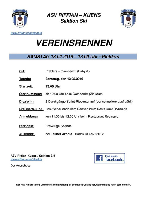 euch heuer organisiert die Sektion Ski des ASV Riffian-Kuens einen Kinderskikurs. Anmeldung und Infos am 05.12.2015 im Sitzungssaal der Gemeinde Riffian.
